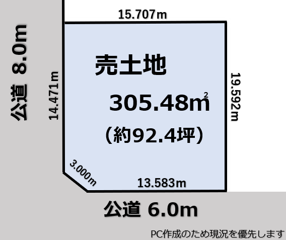 | 土地面積 | 公305.48㎡(92.40坪) | 接道 | 北西側(公道)幅 約8.0m 間口 約17.47m 南西側(公道)幅 約6.0m 間口 約13.58m |